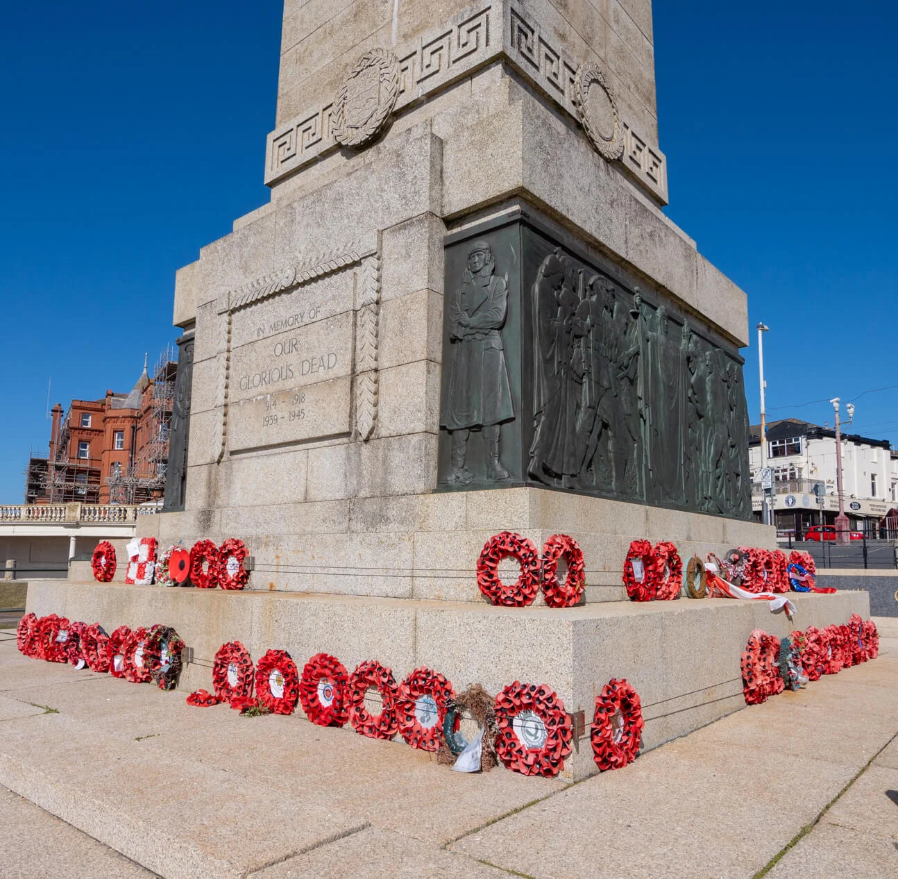 Its strategic location places it amidst other significant landmarks. To the west, the historic North Pier stretches into the Irish Sea, providing a picturesque backdrop. To the south, the elegant Metropole Hotel adds historic charm, while the Blackpool Town Hall, situated on Talbot Road to the east, highlights the civic importance of the area. This proximity to notable buildings enhances the memorial’s role as a central and respected feature of Blackpool’s town centre. The Blackpool War Memorial and Cenotaph is more than just a monument; it embodies the collective memory of a community deeply affected by war. Each year, especially on Remembrance Day, it becomes a focal point for ceremonies and events where local residents and visitors gather to pay their respects, ensuring that the sacrifices made by those who served are honoured and remembered.