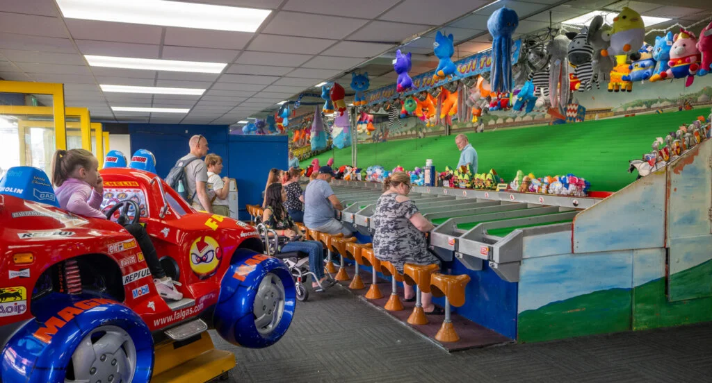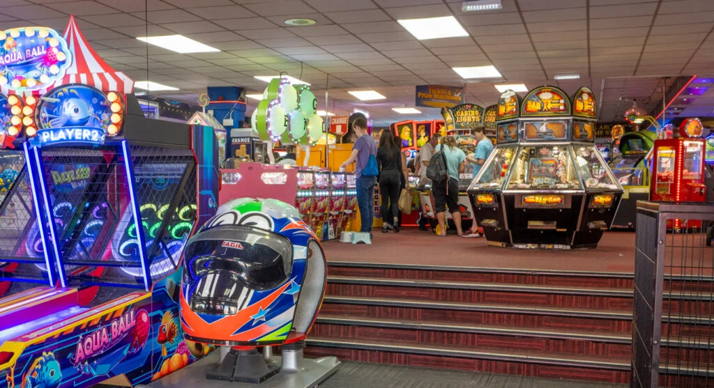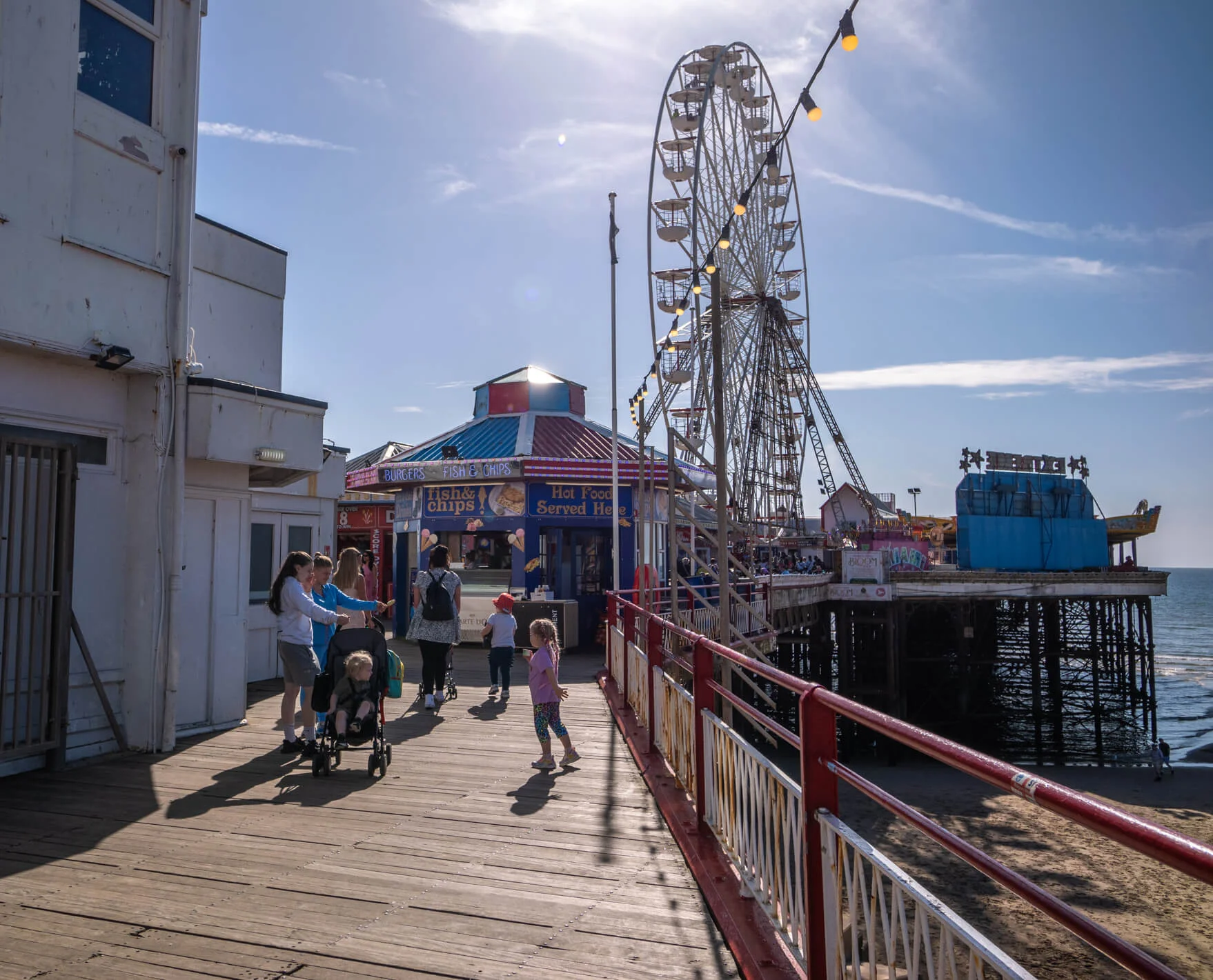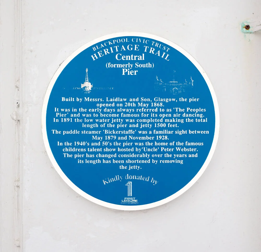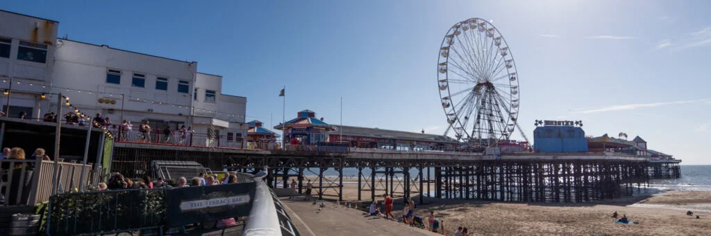 From the start, Central Pier focused on fun rather than the more relaxed atmosphere of North Pier. Early on, it offered dancing facilities, and later, in the 20th century, roller skating, fairground rides, and amusement machines were added. Steamboat excursions also left from the jetty. After World War II, the dance halls became less popular, and by the 1970s, the pier had been transformed into a theatre, bars, and amusement arcades. In 1986, the pierhead theatre was updated and renamed “Peggy Sue’s Showboat”. A significant addition came in 1990 with a 33-metre-high (108 ft) Ferris wheel, which was a modern version of a Victorian attraction that had once been part of the Winter Gardens.