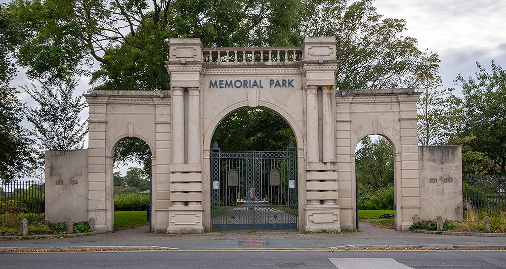 Memorial Park in Fleetwood was established as a living tribute to the town’s World War I fallen. The Fleetwood Heroes’ Fund Committee, formed in 1918 by the Fleetwood Urban District Council (FUDC), fundraised and purchased the grounds from Fleetwood Estates Limited in 1921. Patrick Abercrombie, a pioneer of modern town planning and later renowned for his post-war work, designed the park as part of a broader civic plan. Combining Garden City principles with formal axes, radii, and vistas inspired by Decimus Burton, the park was envisioned as Fleetwood’s civic centre, featuring a war memorial aligned with its entrance. Initial features, such as the remembrance tree avenue and gates by HH Martyn, were introduced in the mid-1920s.