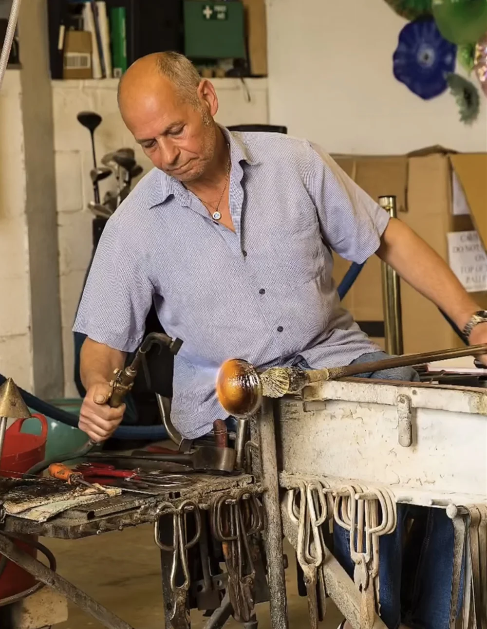 Ditchfield’s journey began in the 1960s in Blackpool, where, at just sixteen, he apprenticed at the Venetian Glass Company. Under the guidance of Italian maestro Franco Toffolo, he absorbed the traditional techniques of Venetian glassblowing, from the simplest forms to the most intricate designs. Eager to expand his horizons, he later travelled across Europe, working with established glass artists in Holland, Germany, and Switzerland. It was during these years that he encountered the shimmering iridescence of Louis Comfort Tiffany’s Art Nouveau glass, a discovery that would shape his own distinctive style.