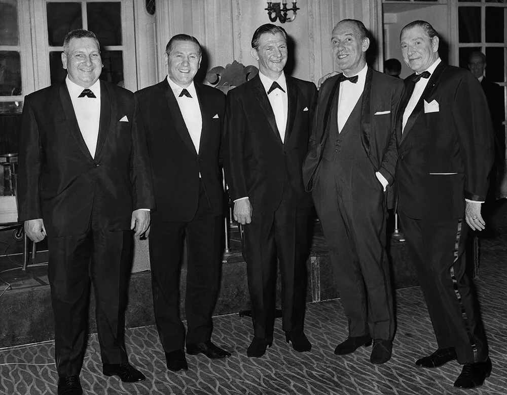 Savoy Hotel, Blackpool. L to R = Sydney Driscoll (Tudor Bingo), Stanley Mortensen (Blackpool FC footballer), Billy Greenwood (Tudor Bingo), Tommy Trinder (comedian), John McKenna (Police Chief). Circa 1969