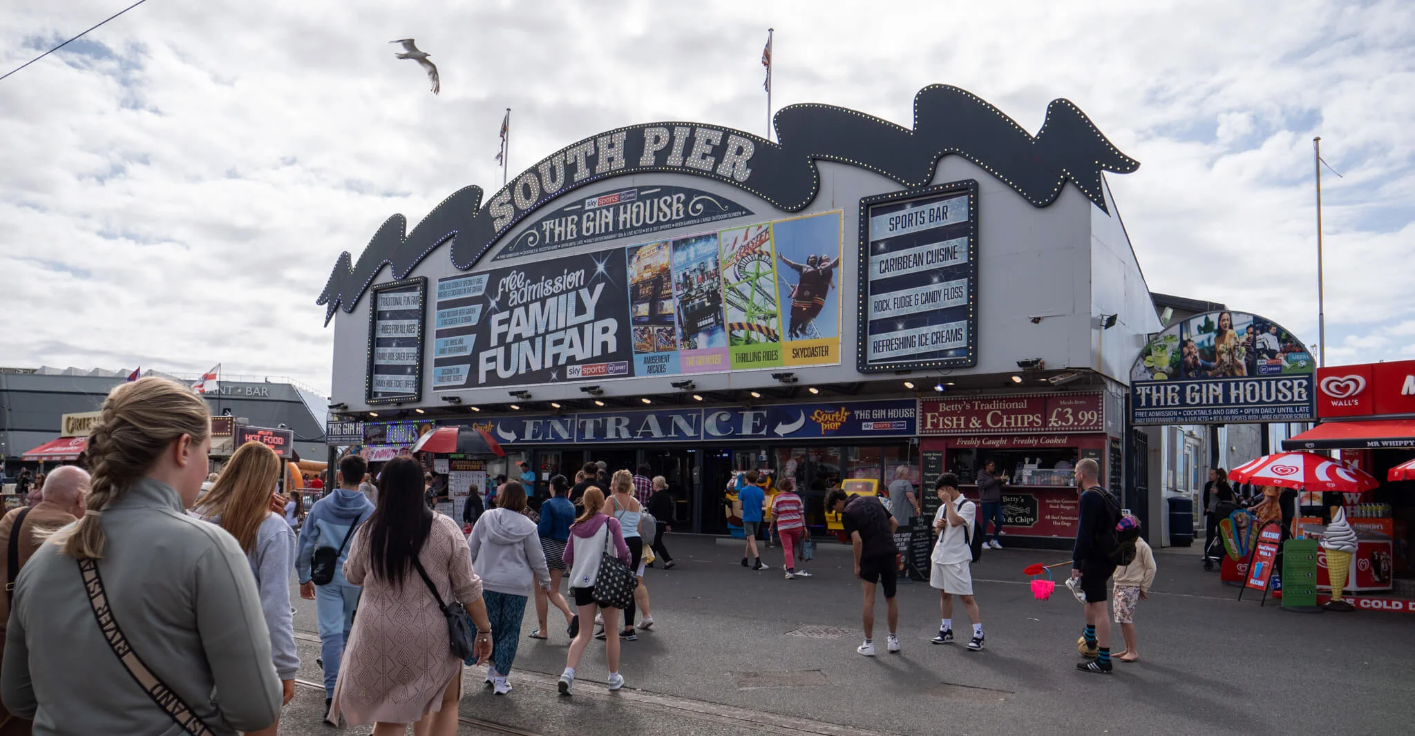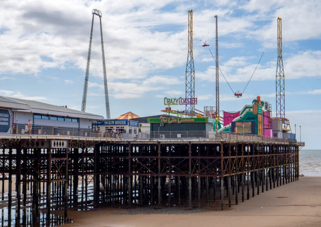 The South Pier, one of Blackpool’s trio of iconic piers, stands alongside its counterparts, the Central and North Piers. Although today it is known as South Pier, when it first opened in 1893, it was named the Victoria Pier. The pier was designed by architect T.P. Worthington and is the youngest of Blackpool’s three piers, despite its age. It was commissioned by the Blackpool South Shore Pier & Pavilion Co. Ltd., with construction starting in 1892 and costing £50,000, a considerable sum at the time. The pier officially opened to the public on Good Friday in 1893, becoming an instant attraction for visitors to the bustling seaside resort.