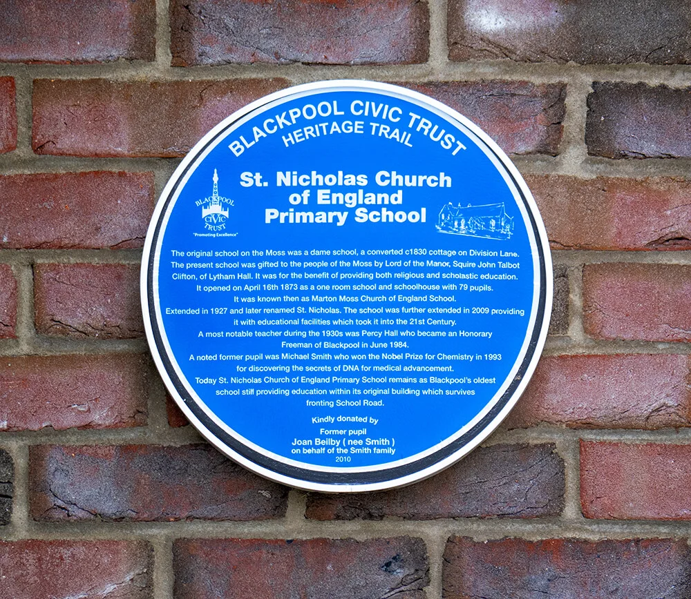 The present school was gifted to the people of the Moss by Lord of the Manor, Squire John Talbot Clifton, of Lytham Hall, with the intention of providing both religious and scholastic education. It was known then as Marton Moss Church of England School, which was extended in 1927 and later renamed St. Nicholas. In 2008 the school was given permission to meet a growing need for pupil places in the south of Blackpool and expanded to two form entry, receiving £5 million to create 80% of a new school whilst refurbishing the remaining 20%. This allowed the school to be extended again in 2009 to provide it with more educational facilities. A most notable teacher during the 1930s was Percy Hall who became an Honorary Freeman of Blackpool in June 1984.