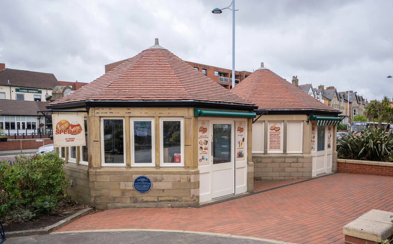 The tramway passenger shelter in St Annes, originally built in 1918, served as a waiting room for passengers of the Lytham St Annes Corporation Tramways. Constructed by the original tramway company, the shelter was located at the junction of A584 Clifton Drive North and St Annes Road West. It was later extended in 1984 and used as the Clock House Café but it is now used as a Spud Hut. The shelter features the words “WAITING ROOM” engraved above the original entrance and a later-added clock.