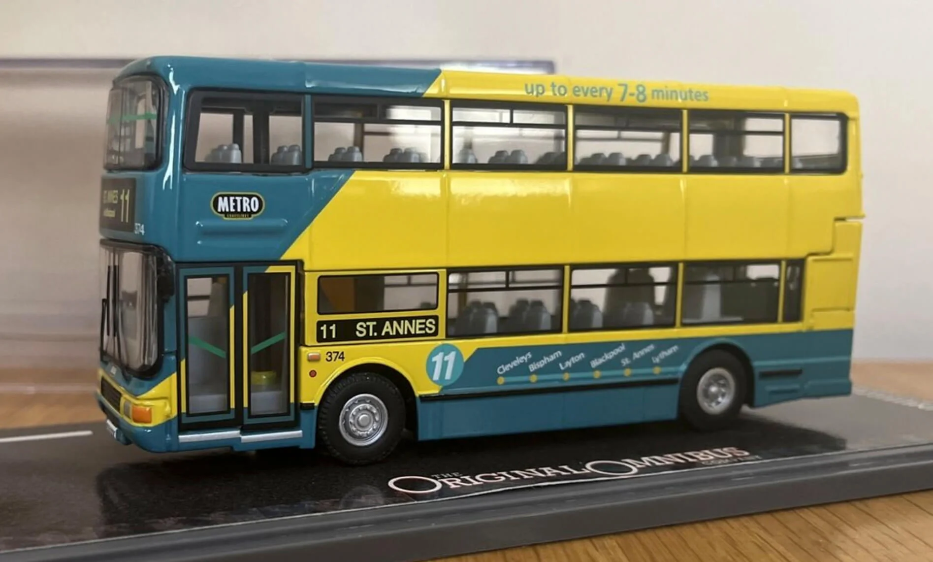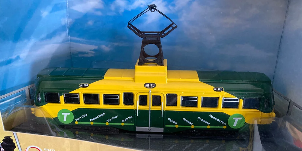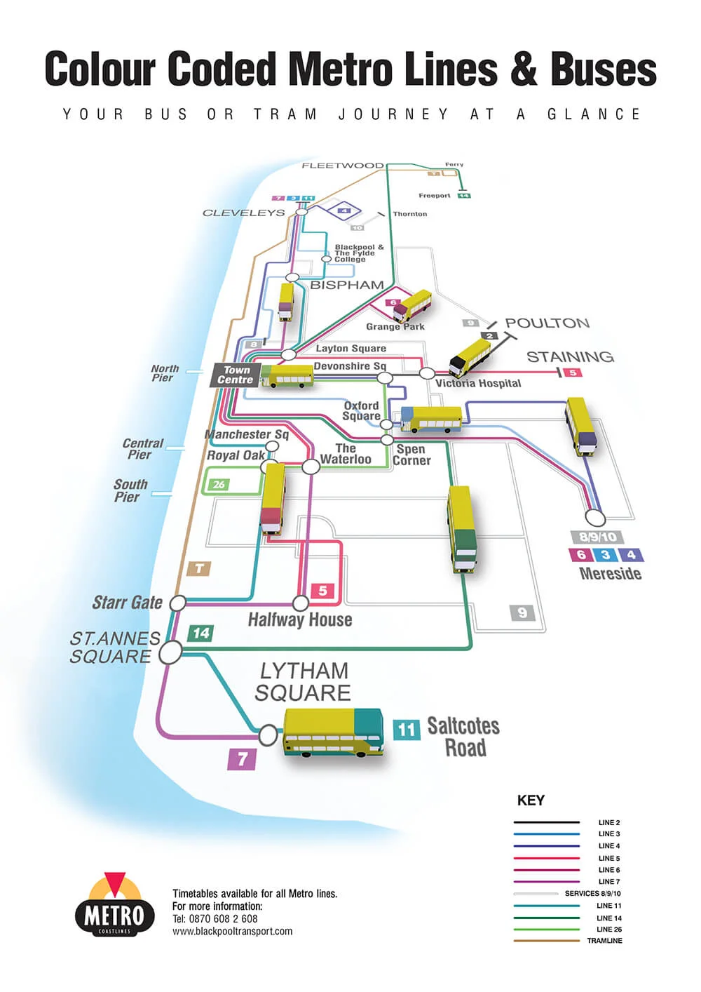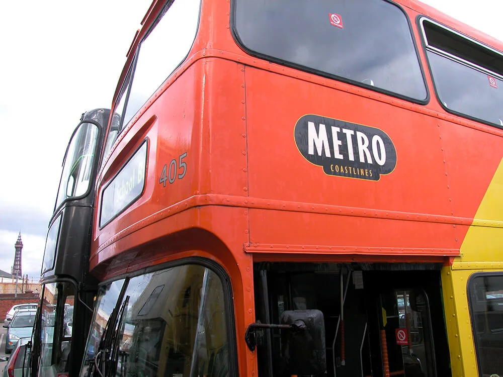In April 2001, Blackpool Transport, the local public transport provider, underwent a significant rebranding, changing its identity to Metro Coastlines. This move was part of an ambitious plan to modernise the service and make it more appealing to locals and tourists alike. As part of the rebrand, Blackpool Transport introduced a new colour-coded system for its bus services, where each main bus route was assigned a distinct colour, creating a visual identity that made it easier for passengers to identify the routes. This colour-coded approach extended to Blackpool’s famous tramway along the promenade, which also adopted a version of this new look. The tram system, already a significant part of the town’s character, was given a modern twist, aligning with the new branding and contributing to the revitalisation of Blackpool’s public transport image. The logo went through a transition from the first version with the arc and triangle, to a later version without the arc and triangle. Alas, the Metro Coastlines brand was short-lived. However, two Metro trams have survived, of a fashion.