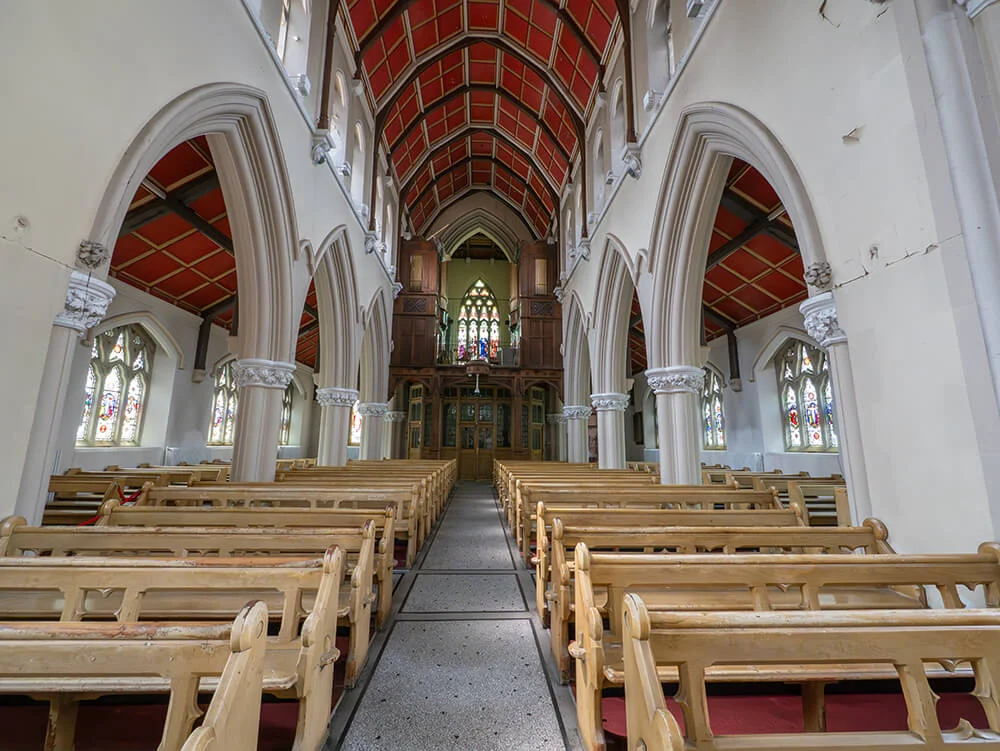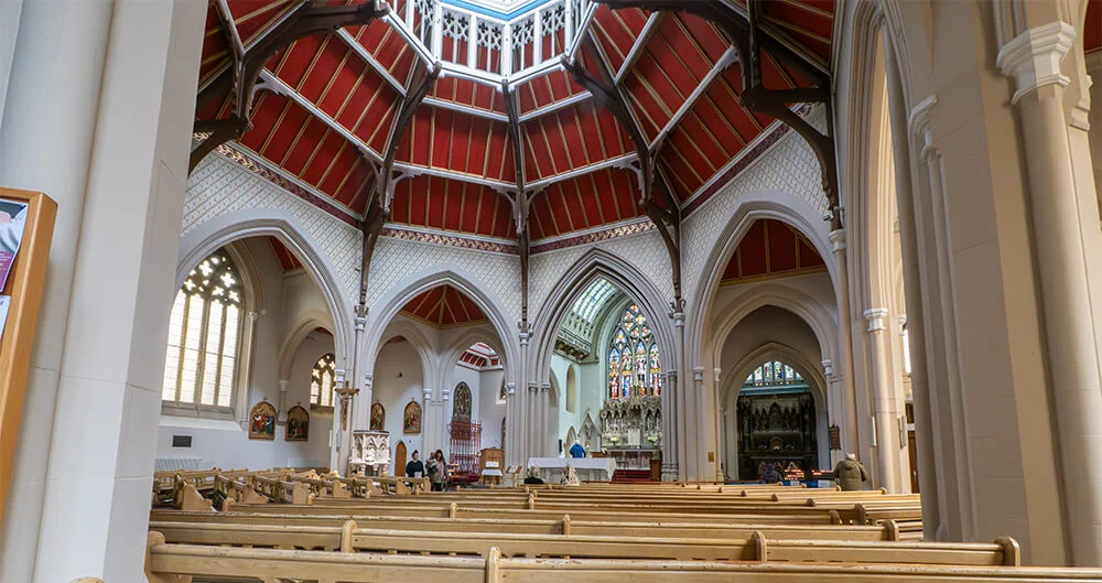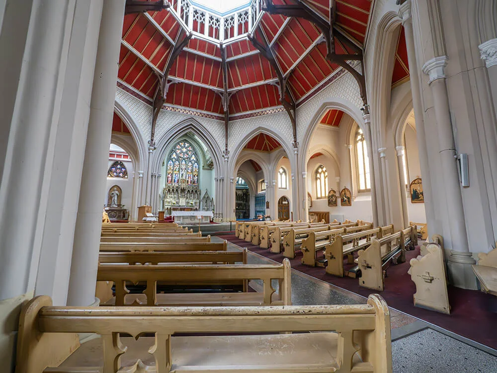 The nave arcades are supported by clustered marble piers with foliated tops and moulded lancet arches. There is a two-bay gallery to the west. The chancel is flanked by two lady chapels. The church fittings include a white marble octagonal pulpit that is carved and sits on red and black columns. There is a Neo-Georgian presbytery to the east of the building that was built c. 1950, and a former school to the west that dates from 1898. The church has no graveyard.
