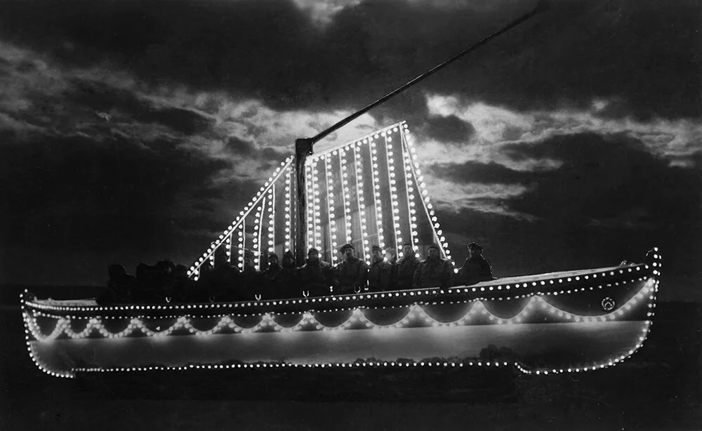 1926 postcard night moonlight view Illuminated Lifeboat Tram, with silhouettes standing lifeboatmen, Blackpool Illuminations.